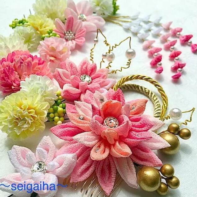 例えば正面からのお写真にも髪飾りが見えるよう左サイドには直径8cmのメインのつまみ細工を。そして後方にかけてピンポンマムとスワロフスキーつまみ細工で華やかに♪