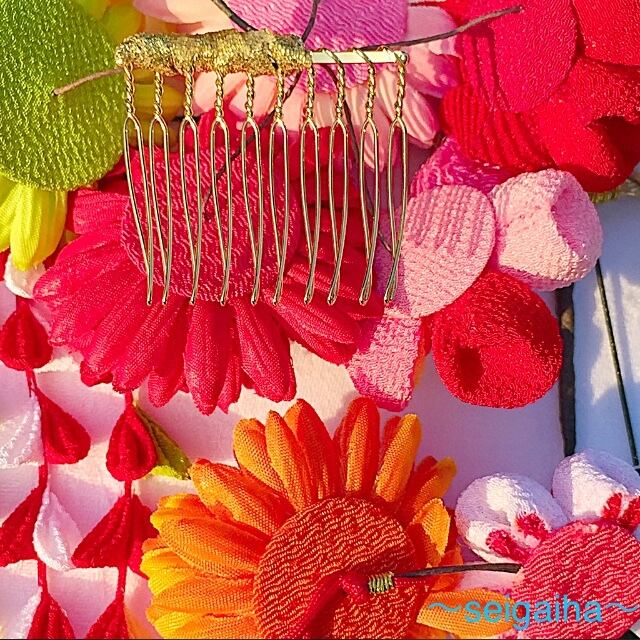 つまみ細工はもちろん、ピンポンマムの裏側も丁寧にちりめんでくるんで髪にやさしい配慮をしています(写真4枚目)