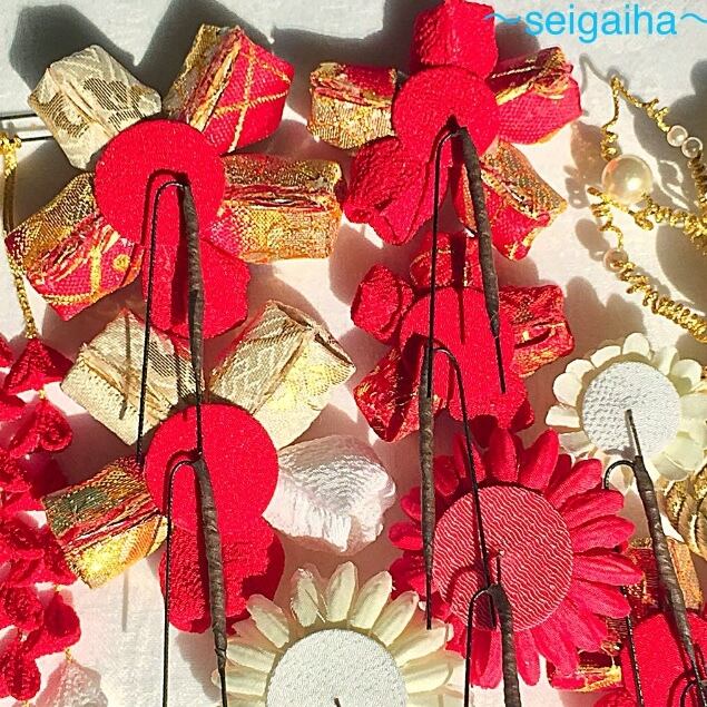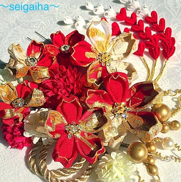 スワロ成人式髪飾り-93紅白金襴 全15点