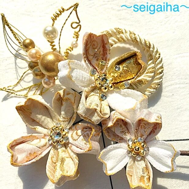 ホワイト×ゴールドの金襴桜のつまみ細工をシンプルに5点セットです。