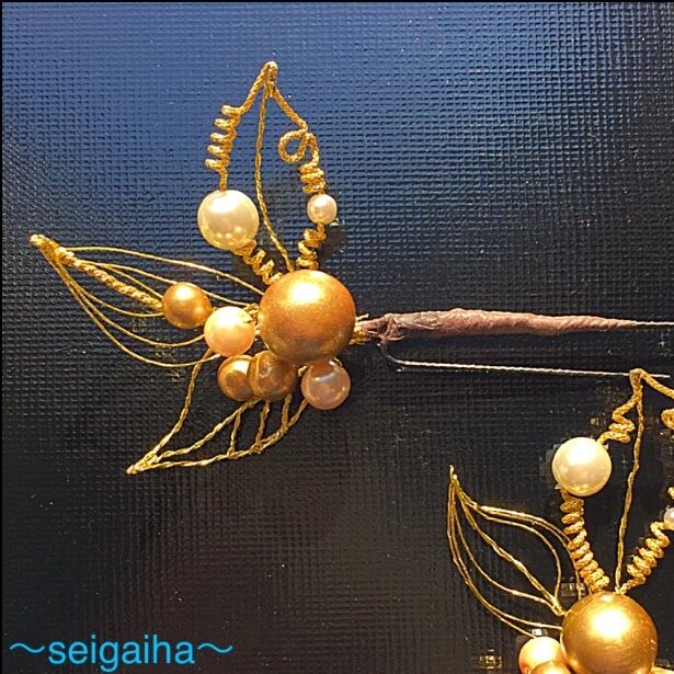 葉型飾り3枚&ゴールド&パール(大小9玉)1点