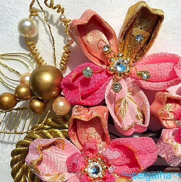 ピンク×ゴールドの金襴桜のつまみ細工をシンプルに5点セットにしました。