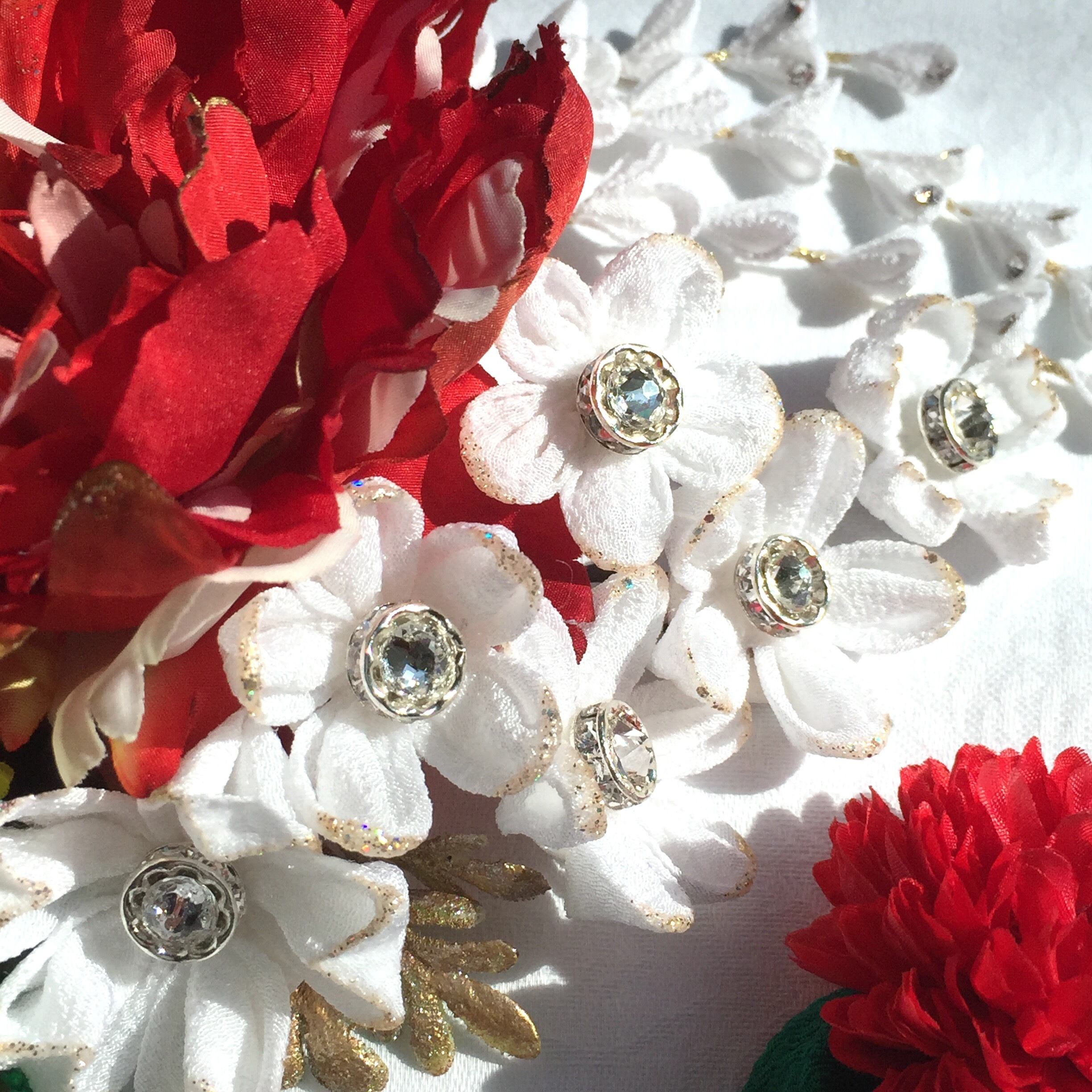 さらにそれぞれの花芯と、大きな紅白ピオニーの花芯にもスワロフスキーが輝きます