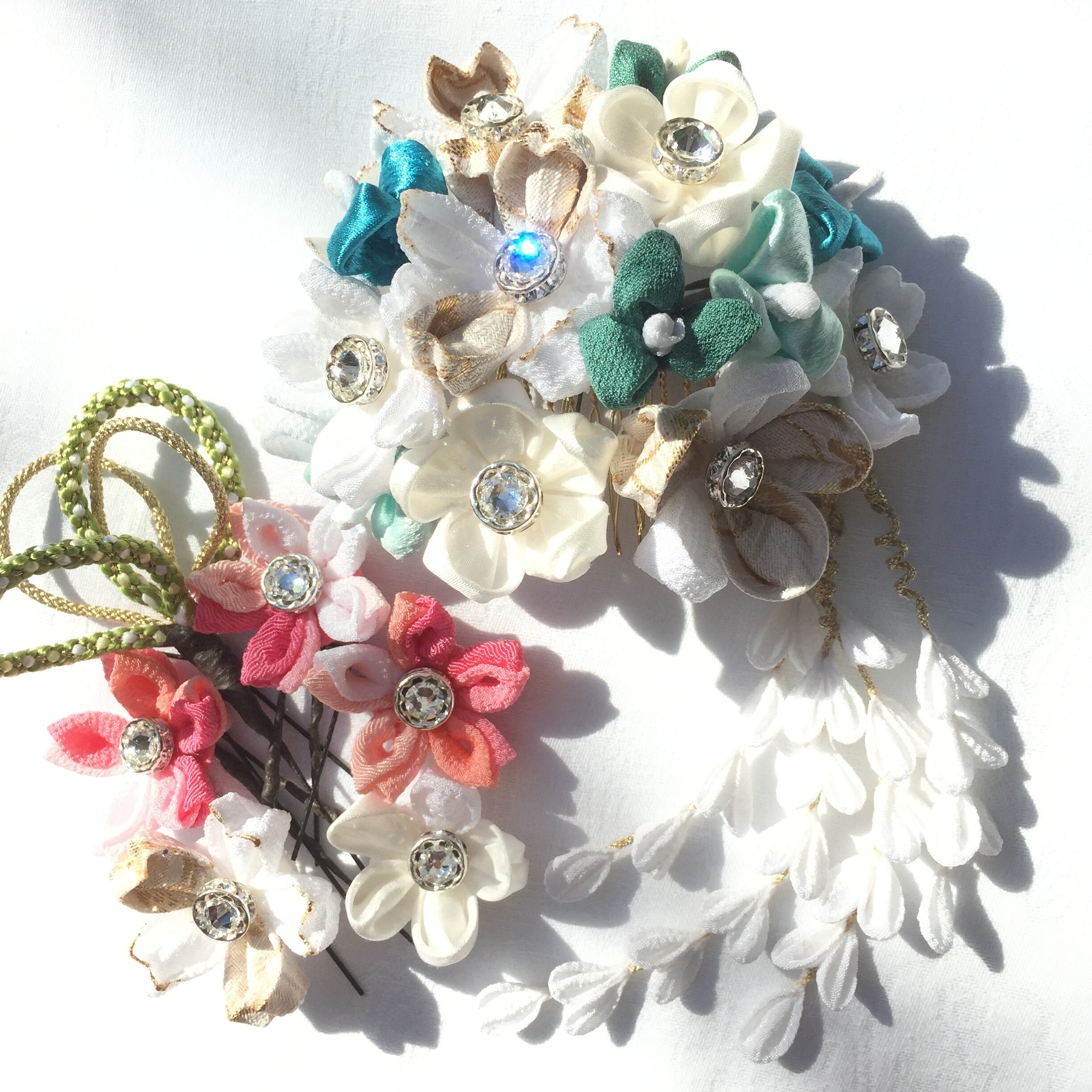 つまみ細工とスワロフスキーのコラボレーション、そんな髪飾りはいかがでしょうか。