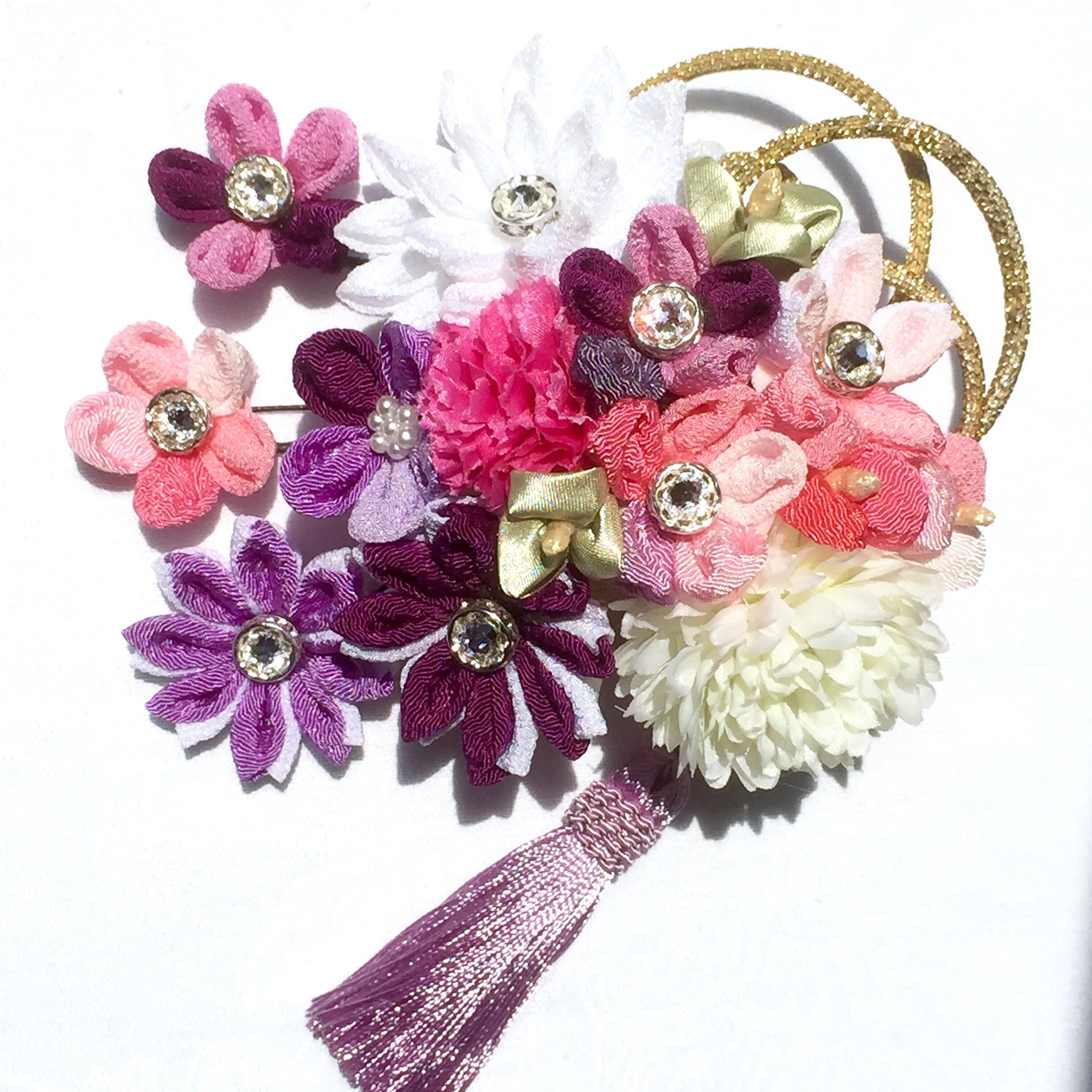 正面からのお写真に映えるようにメイン飾りを側面に飾る際は、挿し方によってお写真の印象がゴールド紐&白いピンポンマムにピンク系の花々の印象か、または白い2段の花と白フチの濃い紫の花々の印象か、それぞれ異なる色味になるよう製作しております