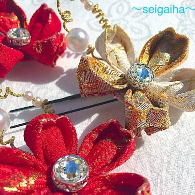 金蘭生地で製作した金フチの桜のつまみ細工、赤2つ白1つの計3個セットです。